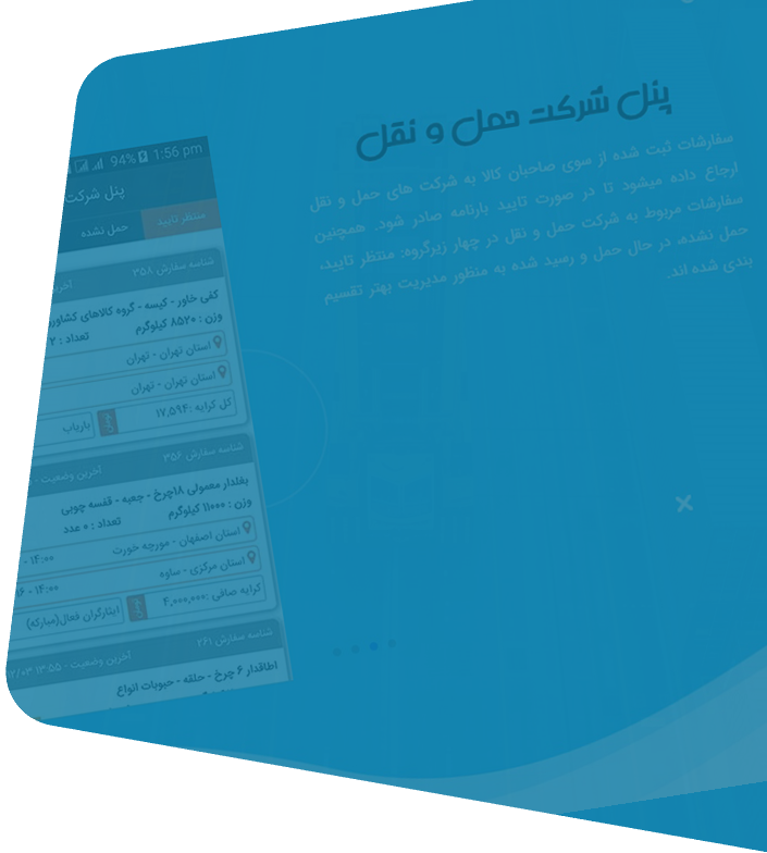 ما در حوزه حملونقل و راهداری فعالیت میکنیم و برنامههای ما شامل سیستم صدور بارنامه الکترونیکی، باریابی هوشمند، مدیریت ناوگان، رهگیری بار و سفر، داشبوردهای مدیریتی، اپلیکیشنهای موبایل و همچنین راهکارهای سفارشیسازیشده متناسب با نیاز شرکتهای حملونقل و تعاونیها است.